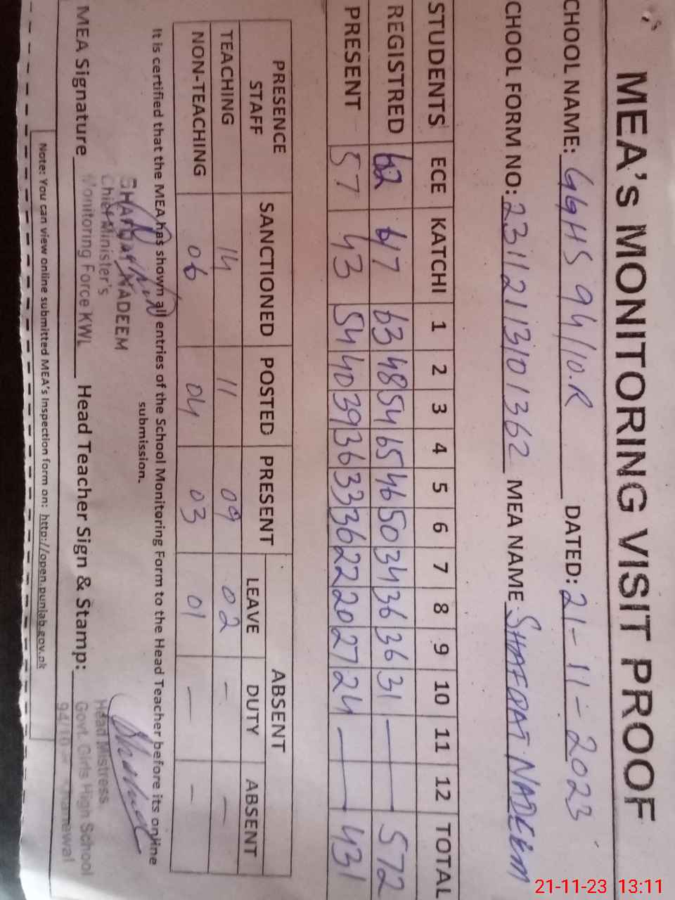 | Attendance Register | Head Teacher | MEA with School | Visit Proof |