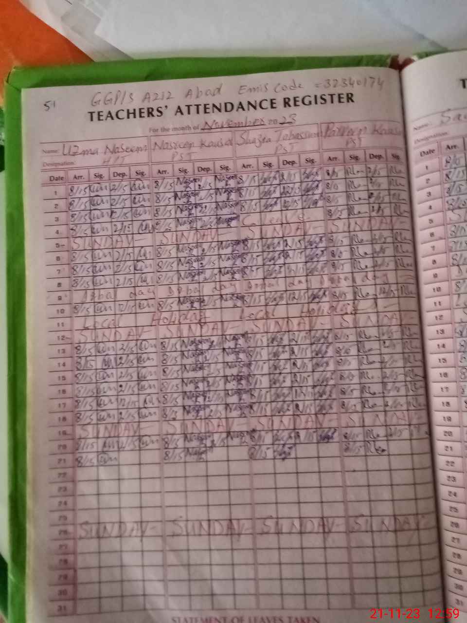 | EMIS Code: 32340174 | Name of School: GGPS AZIZ ABAD | |||