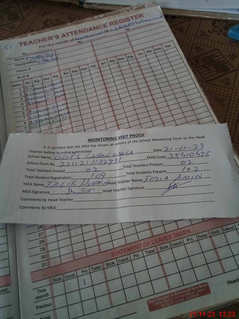 | Attendance Register | Head Teacher | MEA with School | Visit Proof |