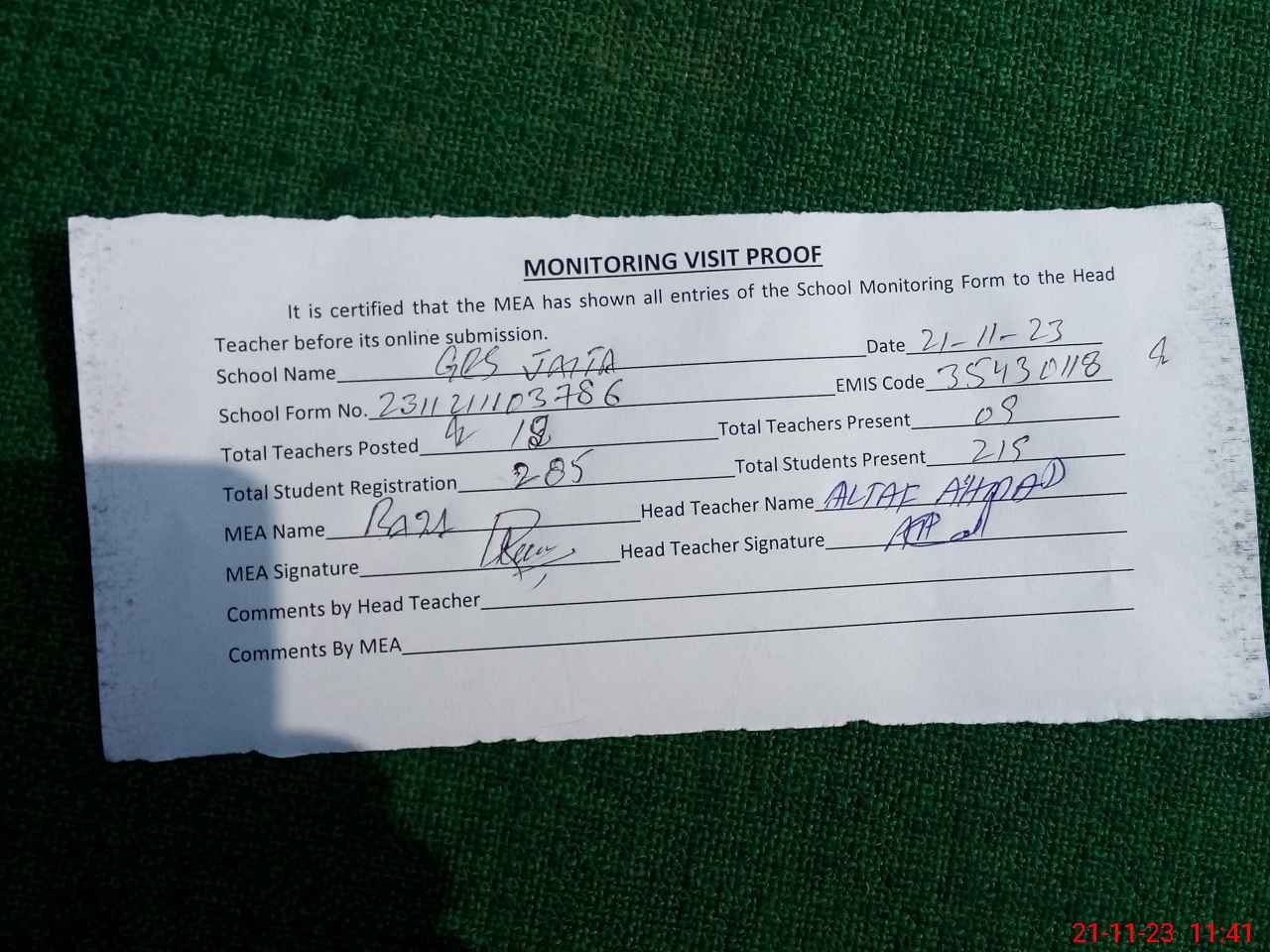 | Attendance Register | Head Teacher | MEA with School | Visit Proof |