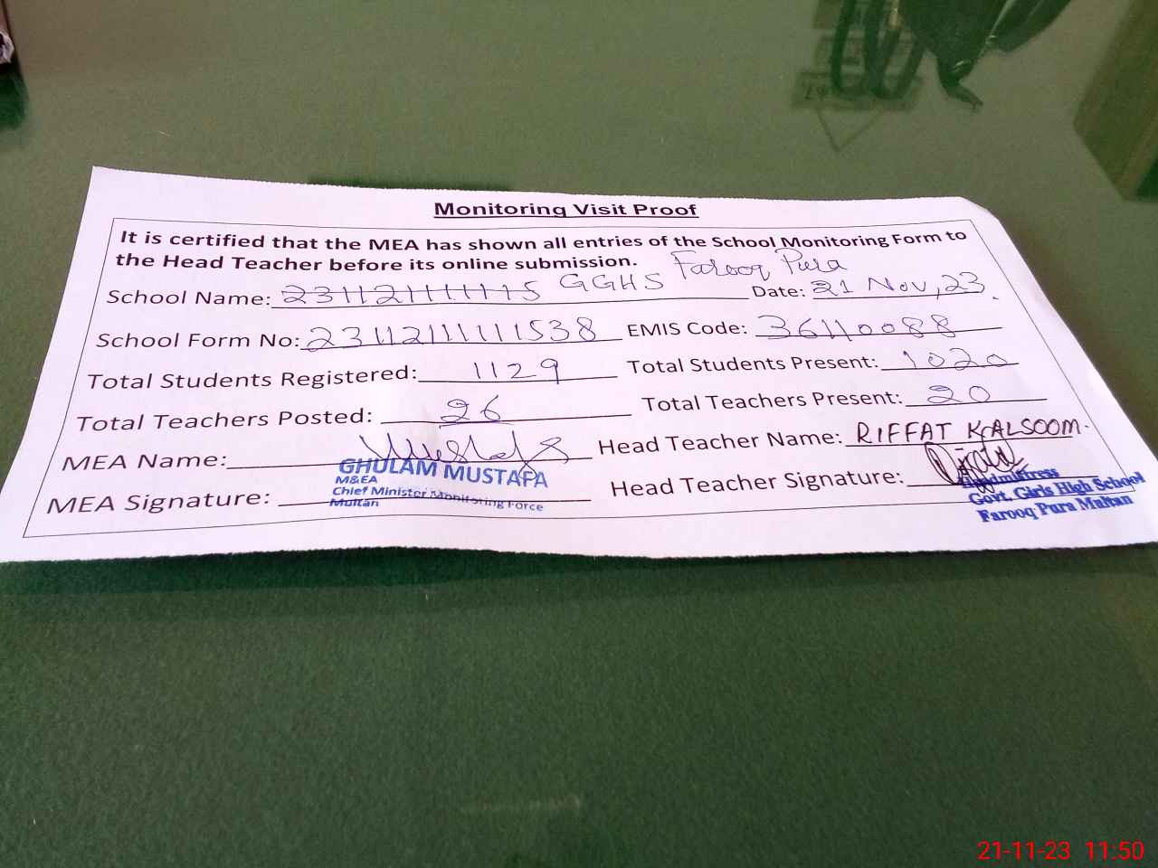 | EMIS Code: 36110088 | Name of School: GGHS FAROOQ PURA OLD SHUJABAD ROAD MULTAN | |||