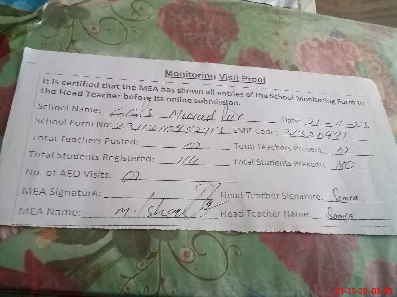| EMIS Code: 31320991 | Name of School: GGPS MURAD PUR SIAL | |||