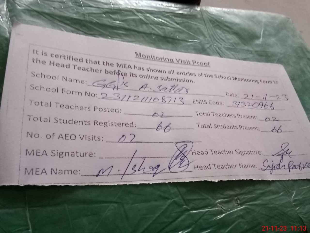 | Attendance Register | Head Teacher | MEA with School | Visit Proof |