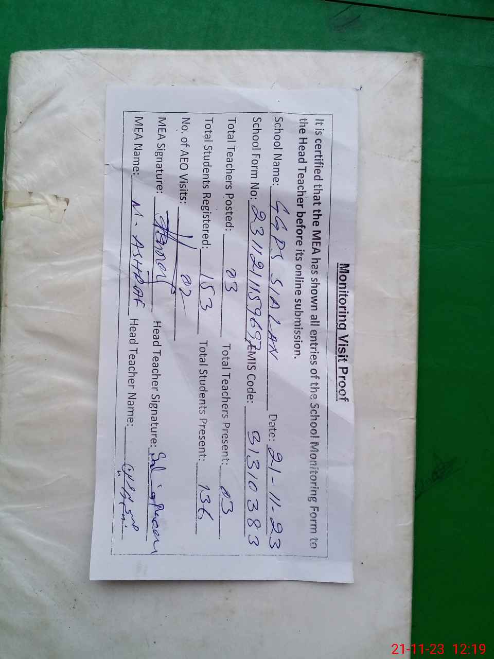 | Attendance Register | Head Teacher | MEA with School | Visit Proof |