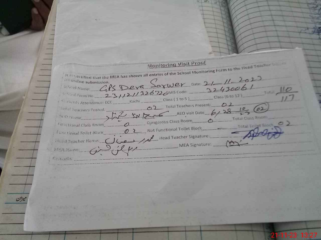 | Attendance Register | Head Teacher | MEA with School | Visit Proof |