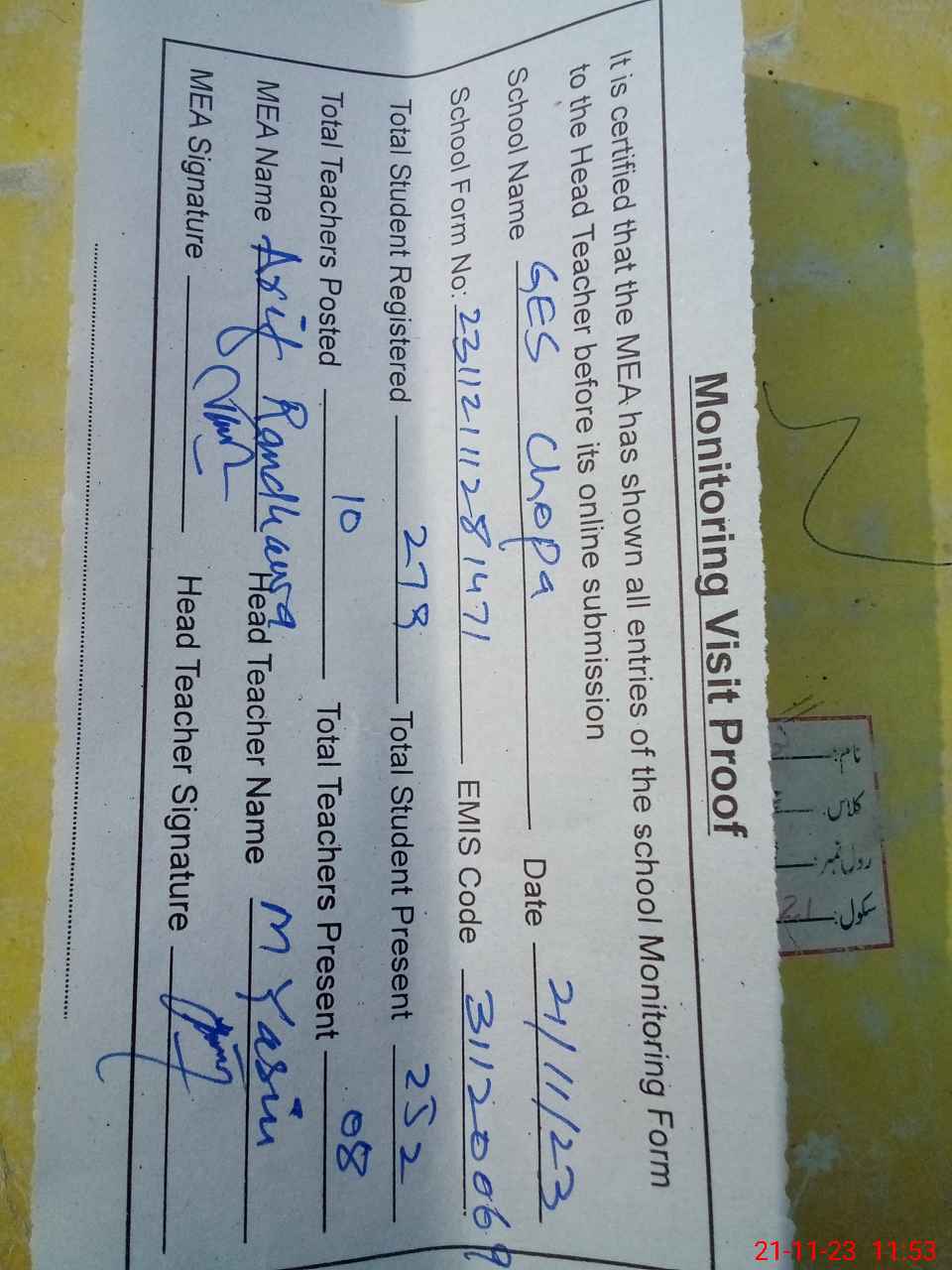 | Attendance Register | Head Teacher | MEA with School | Visit Proof |