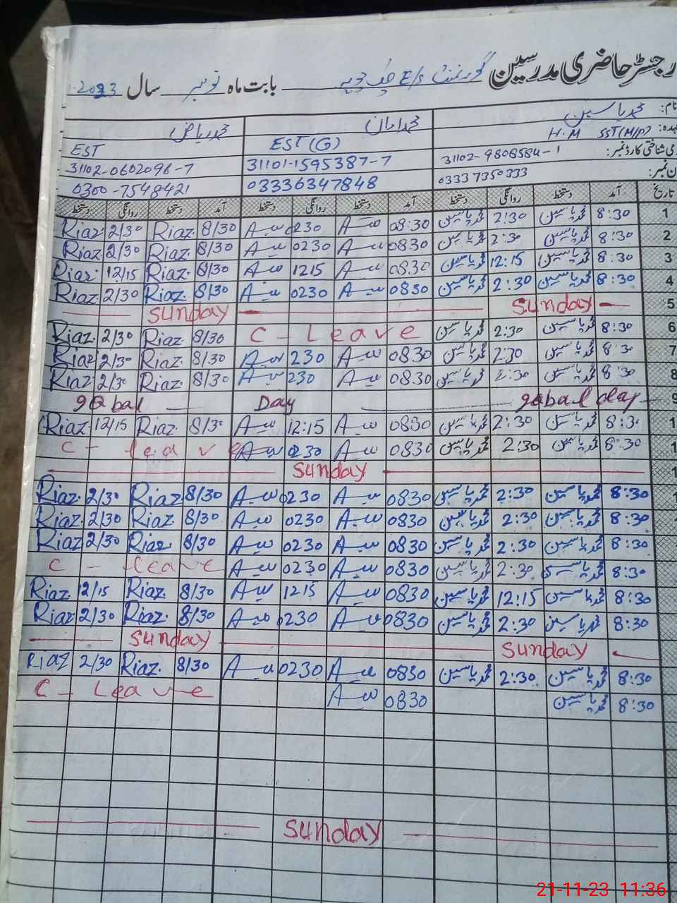 | CNIC | Full Name | Designation | R/C | Absence During Last Calender Month |