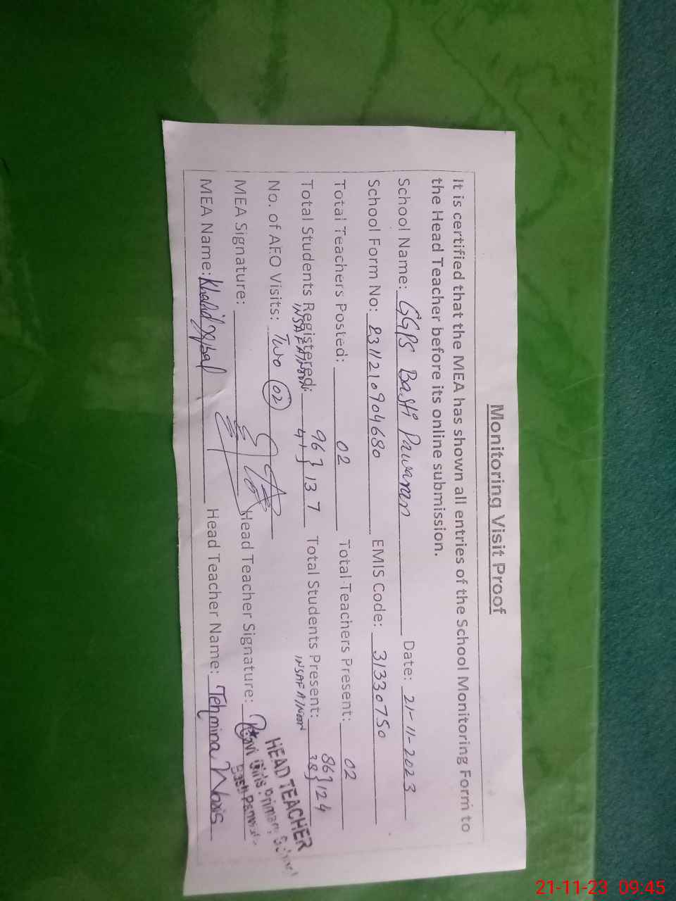 | Attendance Register | Head Teacher | MEA with School | Visit Proof |