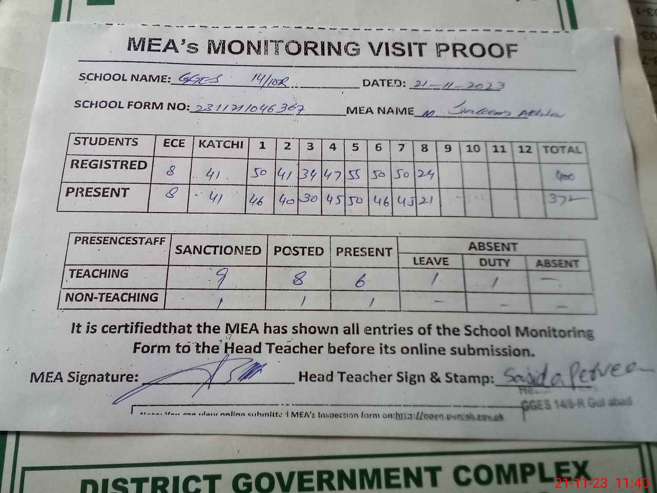 | Attendance Register | Head Teacher | MEA with School | Visit Proof |