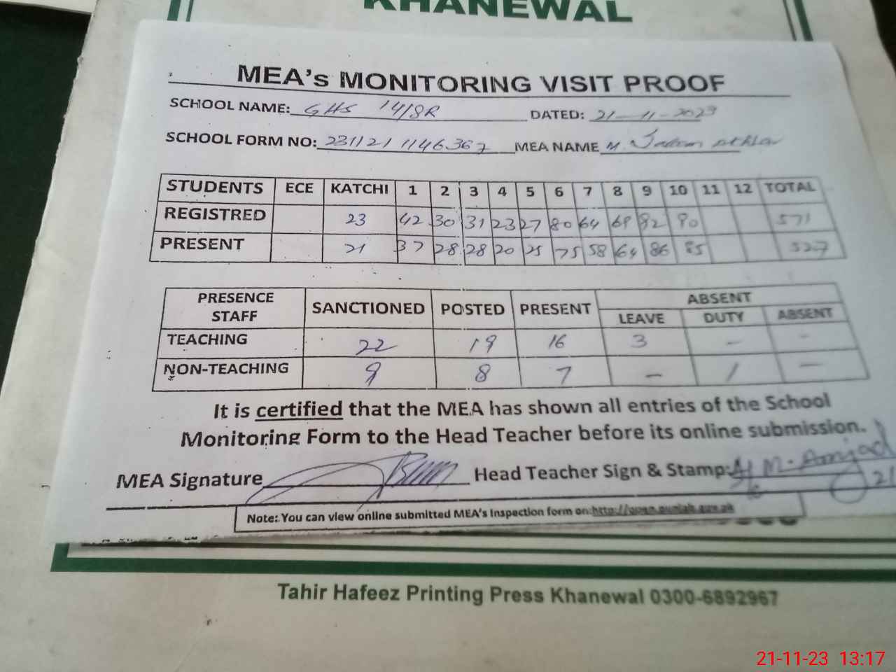 | Attendance Register | Head Teacher | MEA with School | Visit Proof |