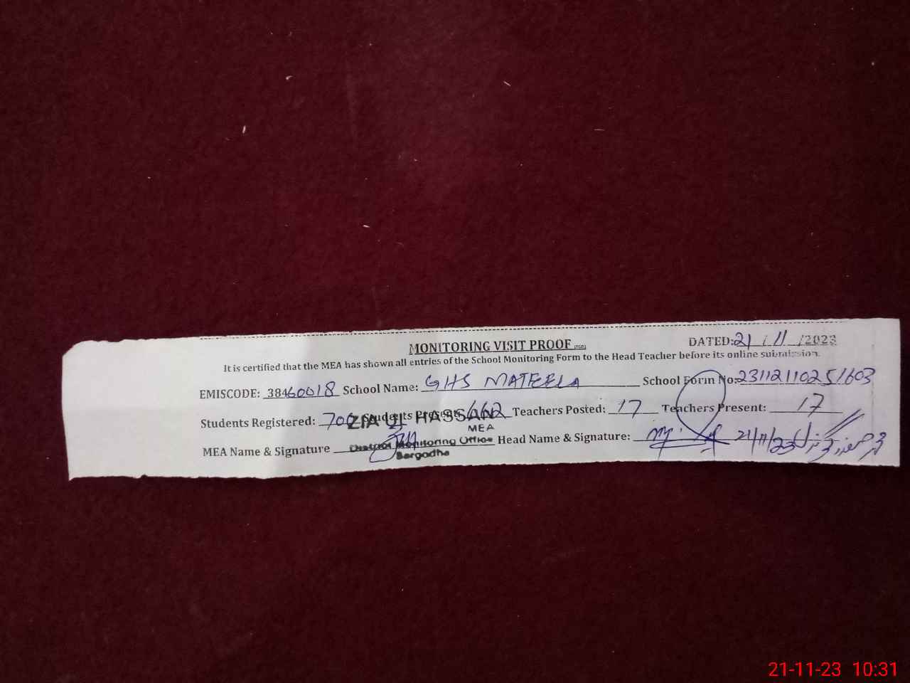 | Attendance Register | Head Teacher | MEA with School | Visit Proof |