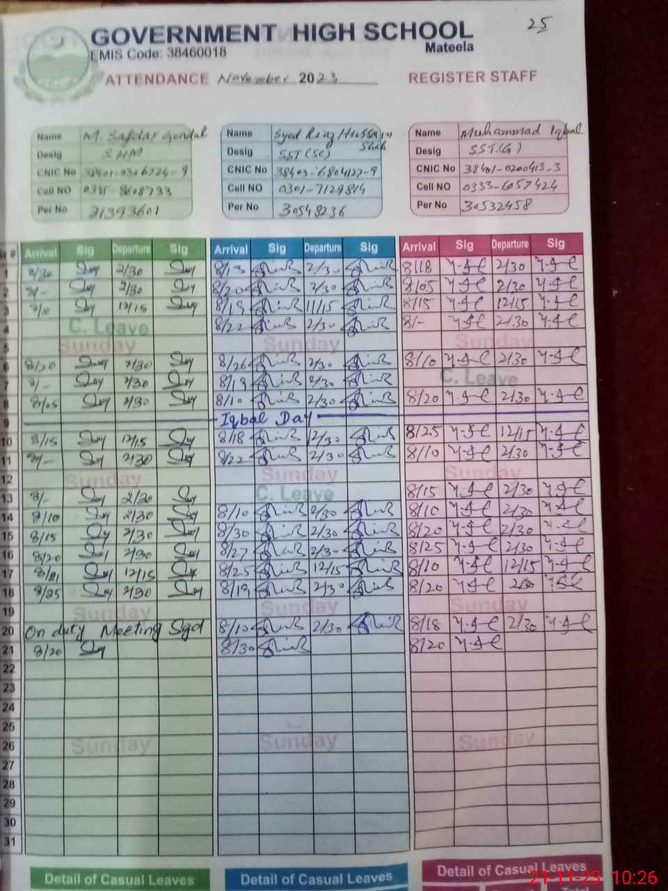 | CNIC | Full Name | Designation | R/C | Absence during last cal. month |
