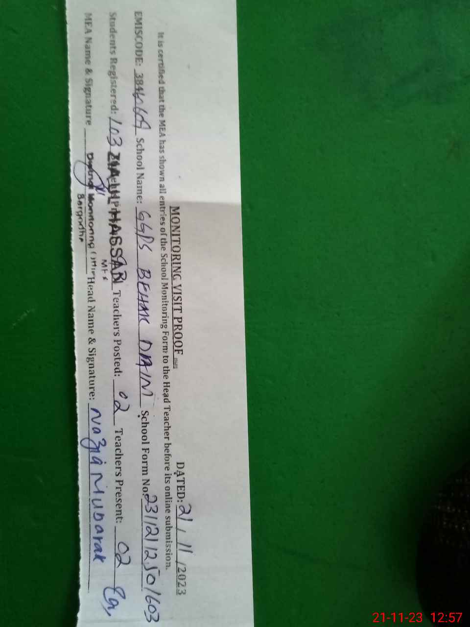 | Monitoring Date: 21-11-2023 | Start Time: 21-11-2023 12:25 PM | End Time: 21-11-2023 12:57 PM | Name of MEA: ZI**** ULHA**** | |