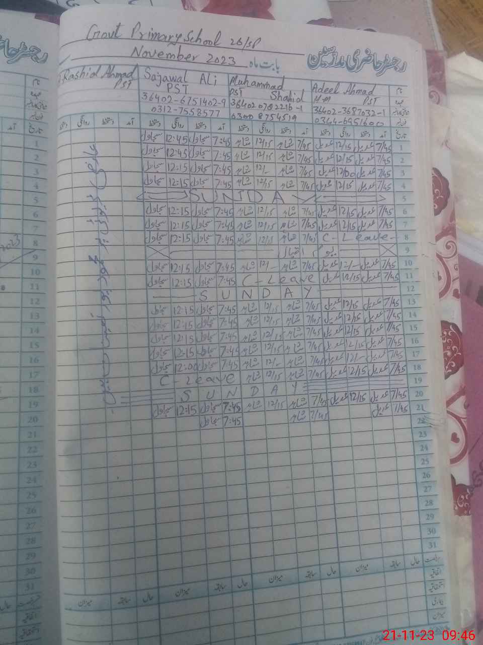 | CNIC | Full Name | Designation | R/C | Absence During Last Calender Month |