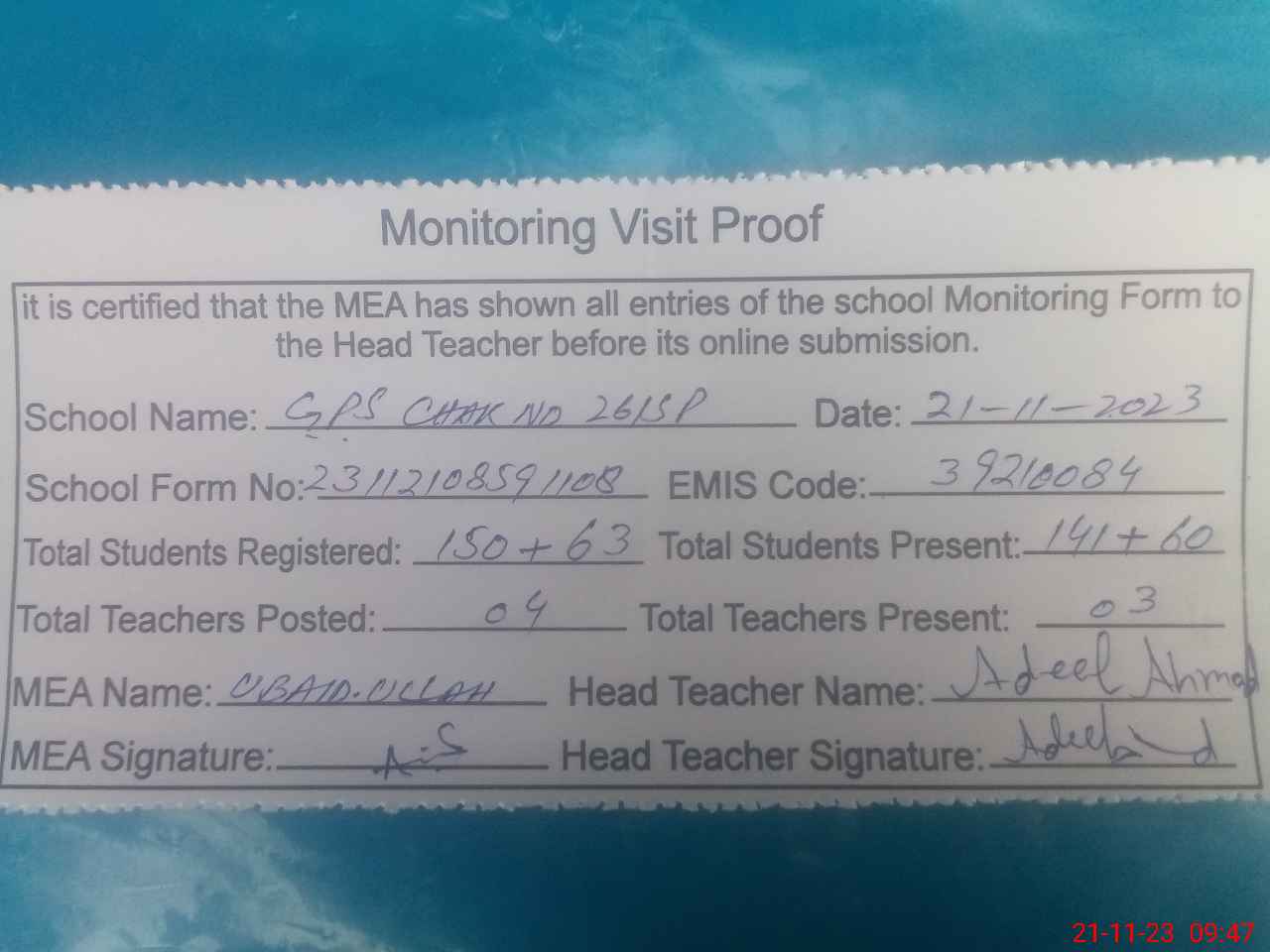 | Attendance Register | Head Teacher | MEA with School | Visit Proof |