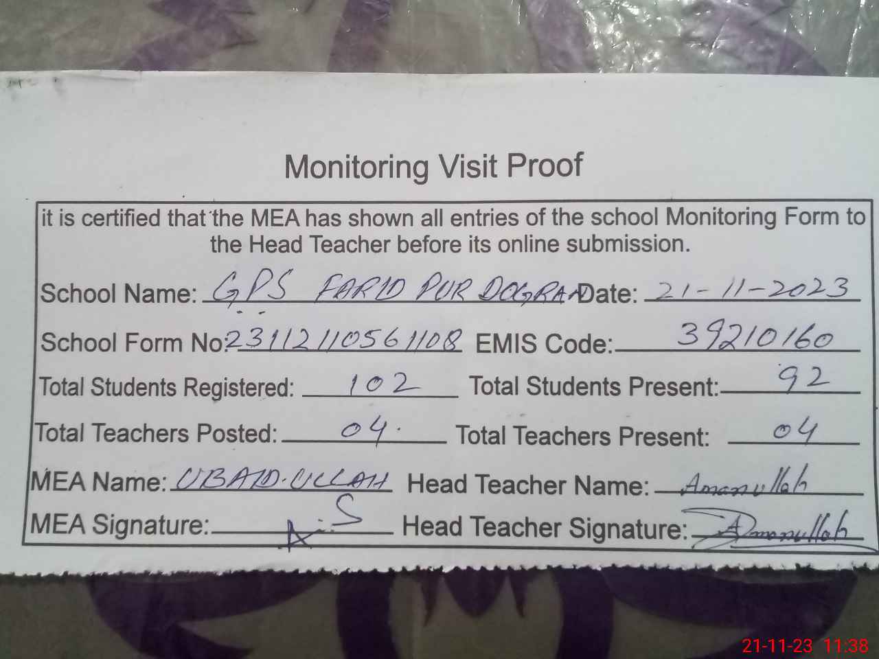 | Attendance Register | Head Teacher | MEA with School | Visit Proof |