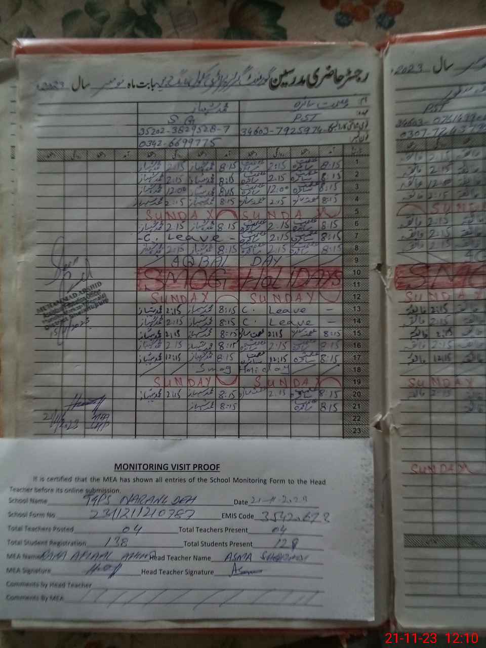 | Attendance Register | Head Teacher | MEA with School | Visit Proof |