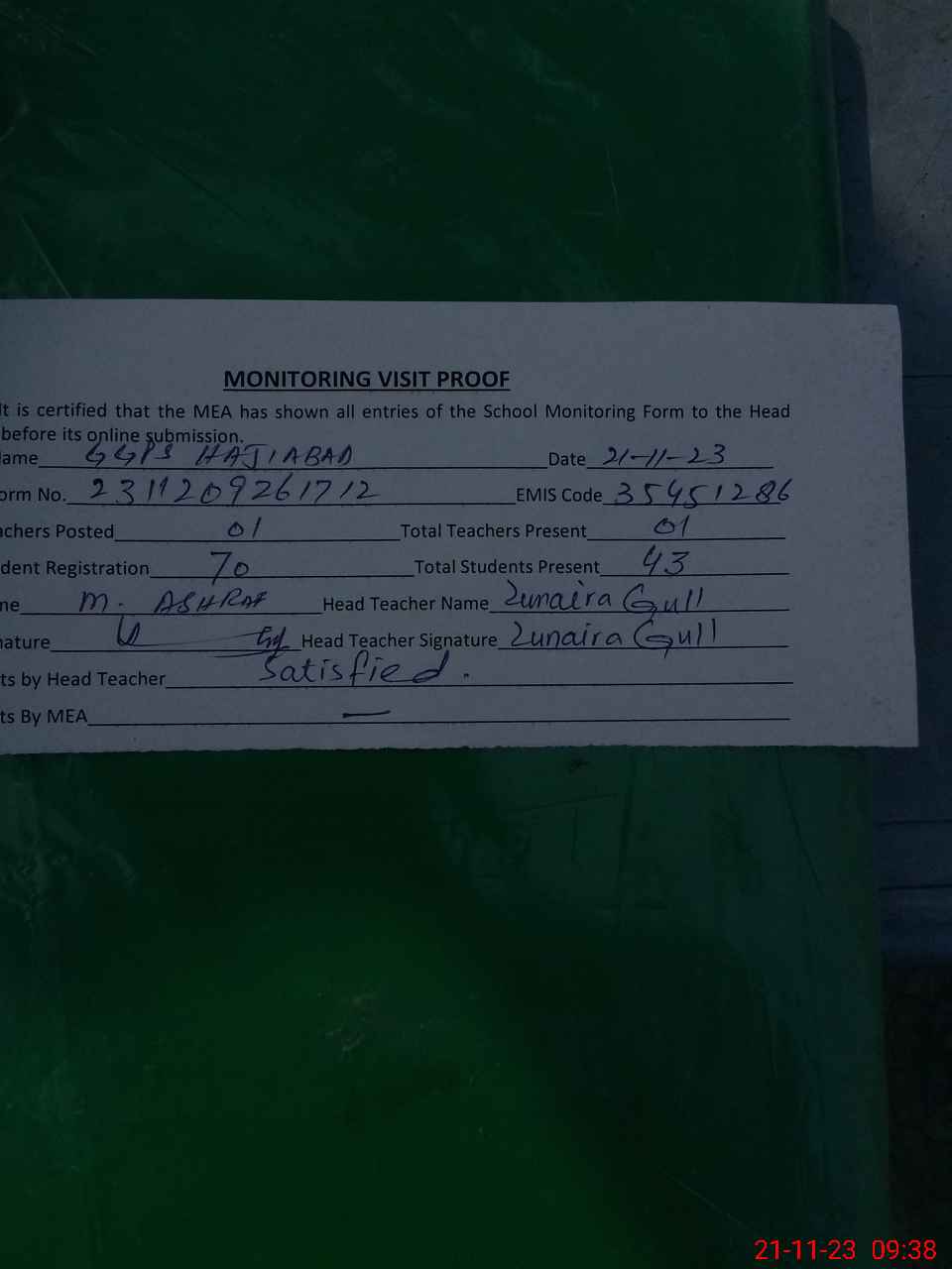 | Attendance Register | Head Teacher | MEA with School | Visit Proof |