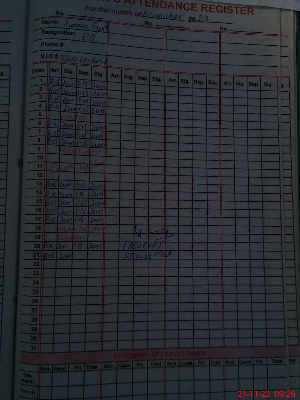 | CNIC | Full Name | Designation | R/C | Absence During Last Calender Month |