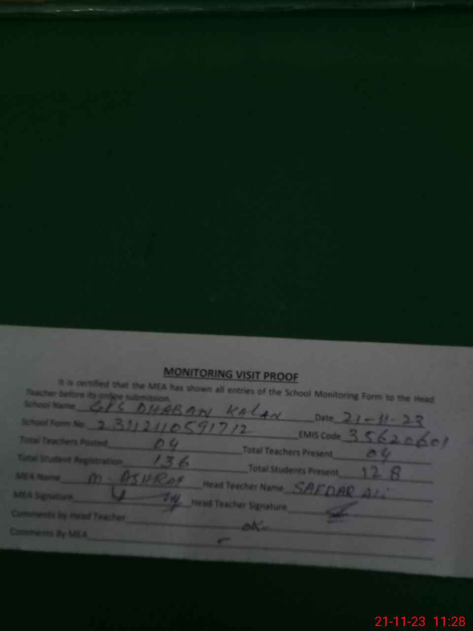 | Attendance Register | Head Teacher | MEA with School | Visit Proof |