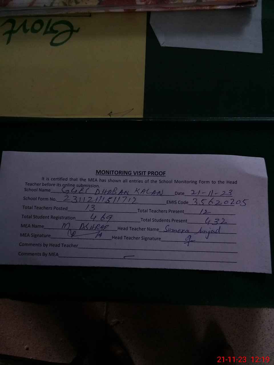 | Attendance Register | Head Teacher | MEA with School | Visit Proof |