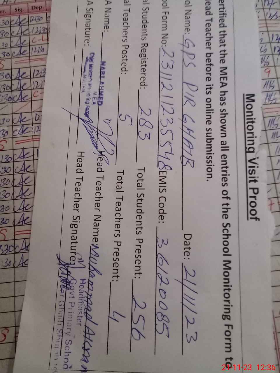| Attendance Register | Head Teacher | MEA with School | Visit Proof |