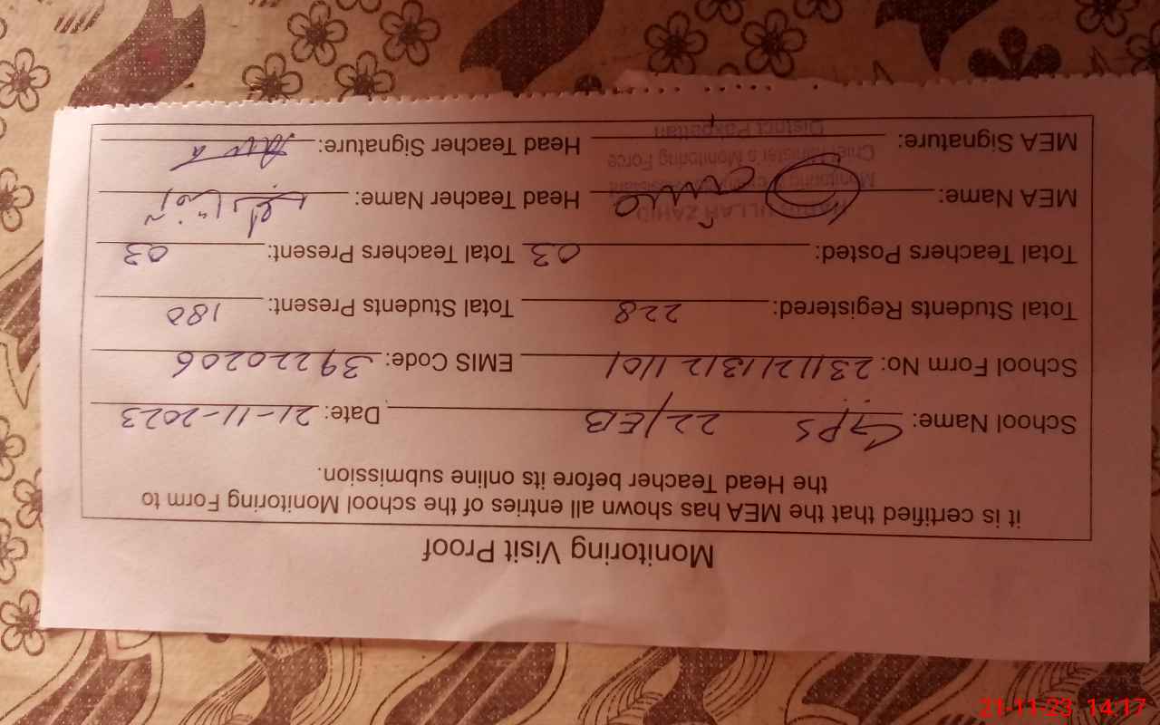 | Attendance Register | Head Teacher | MEA with School | Visit Proof |