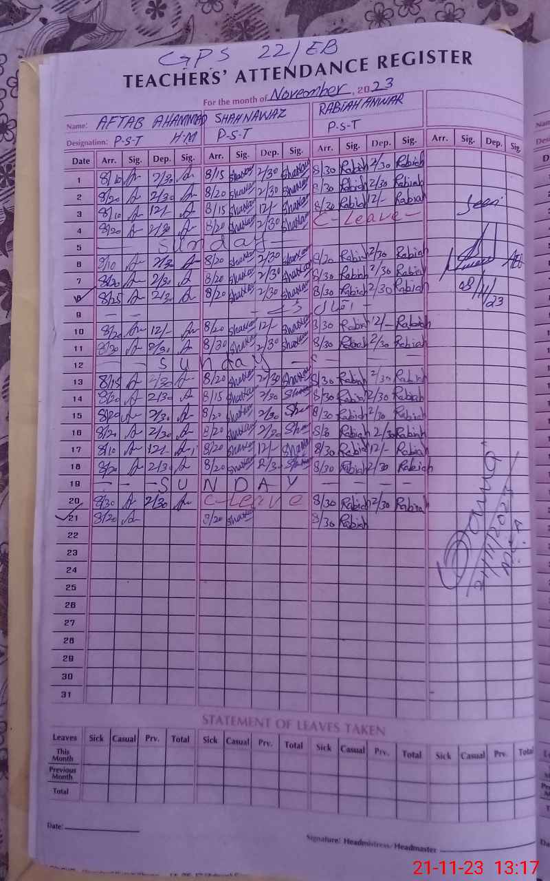 | CNIC | Full Name | Designation | R/C | Absence During Last Calender Month |