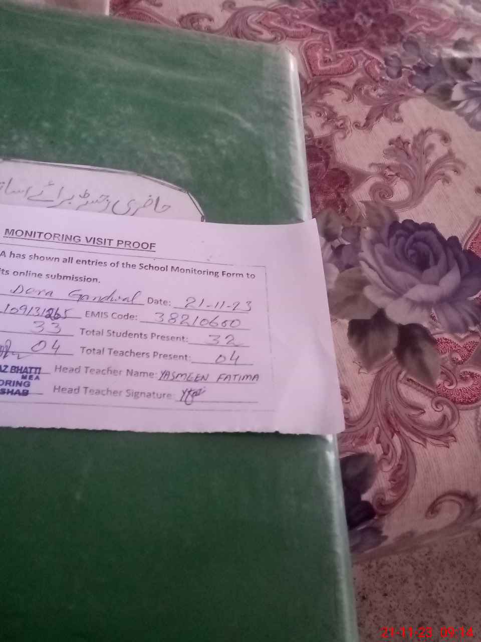 | Attendance Register | Head Teacher | MEA with School | Visit Proof |