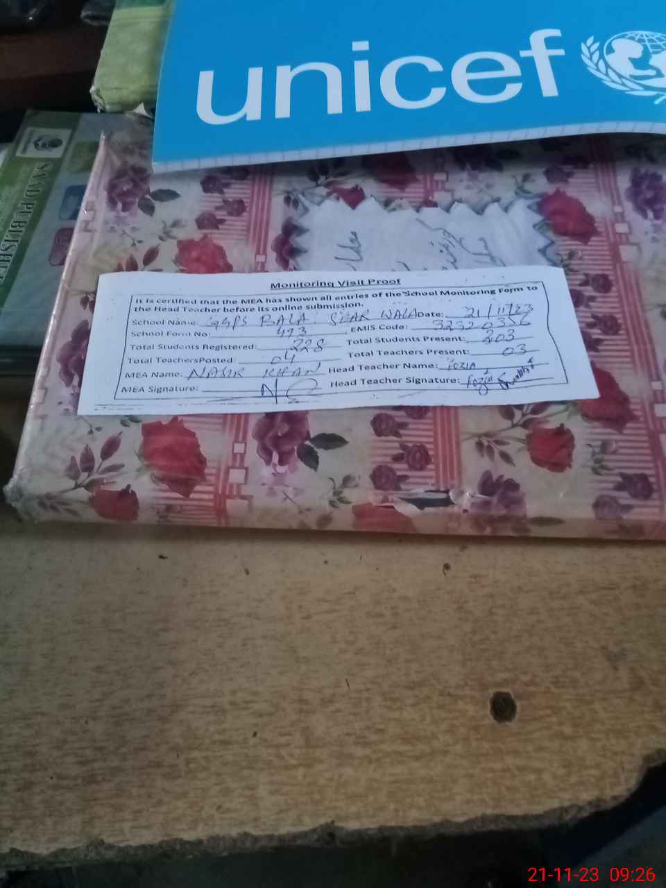 | Attendance Register | Head Teacher | MEA with School | Visit Proof |