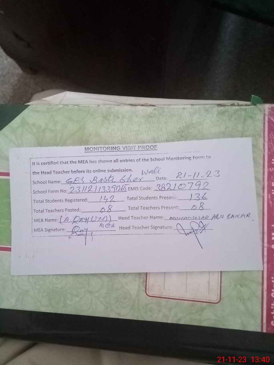 | Attendance Register | Head Teacher | MEA with School | Visit Proof |
