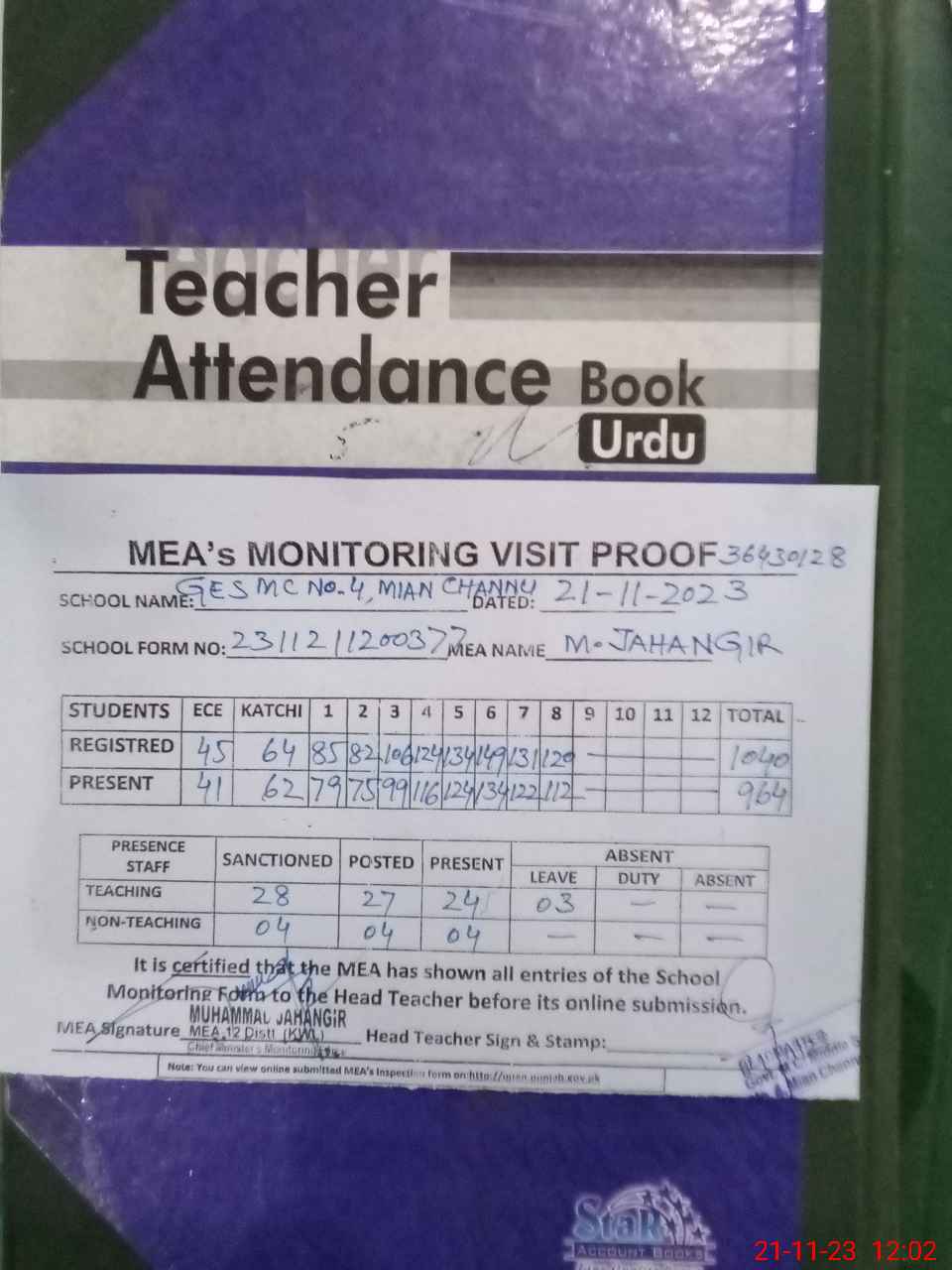 | Attendance Register | Head Teacher | MEA with School | Visit Proof |
