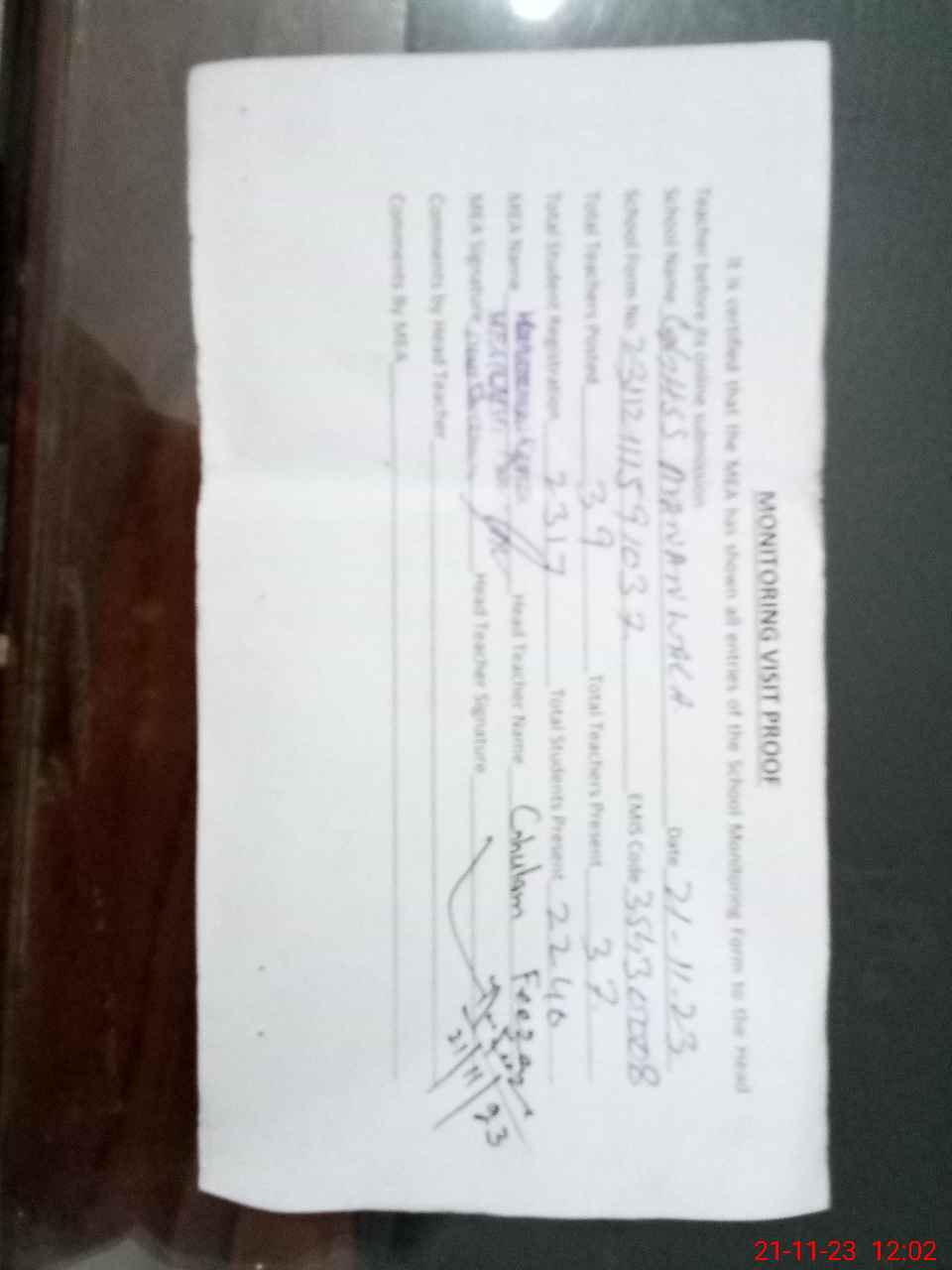 | Attendance Register | Head Teacher | MEA with School | Visit Proof |