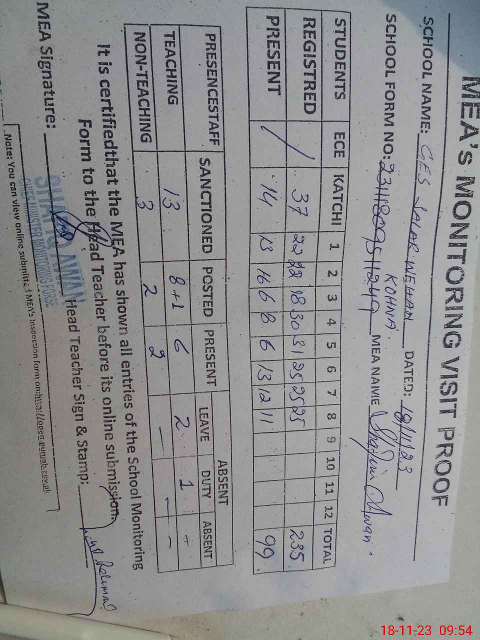 | Attendance Register | Head Teacher | MEA with School | Visit Proof |