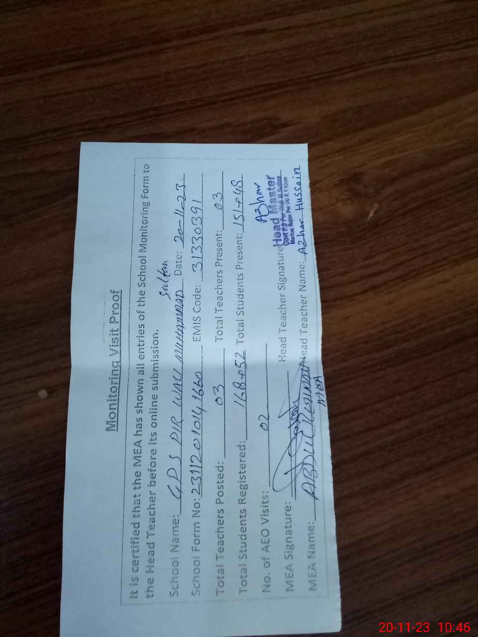| EMIS Code: 31330391 | Name of School: GPS PIR WALI MUHAMMAD SULTAN | |||