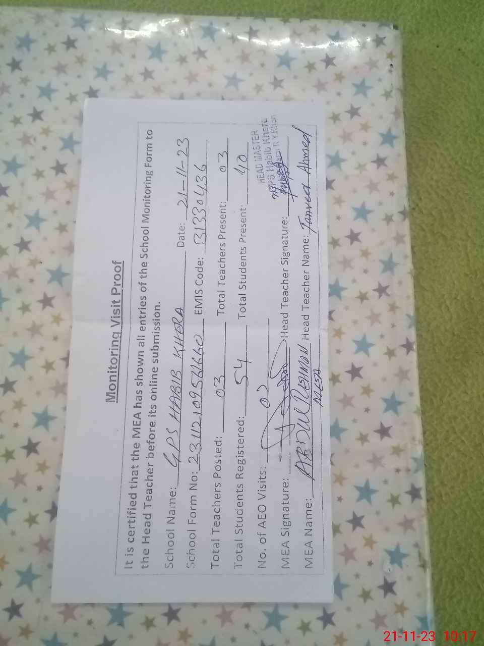 | Attendance Register | Head Teacher | MEA with School | Visit Proof |