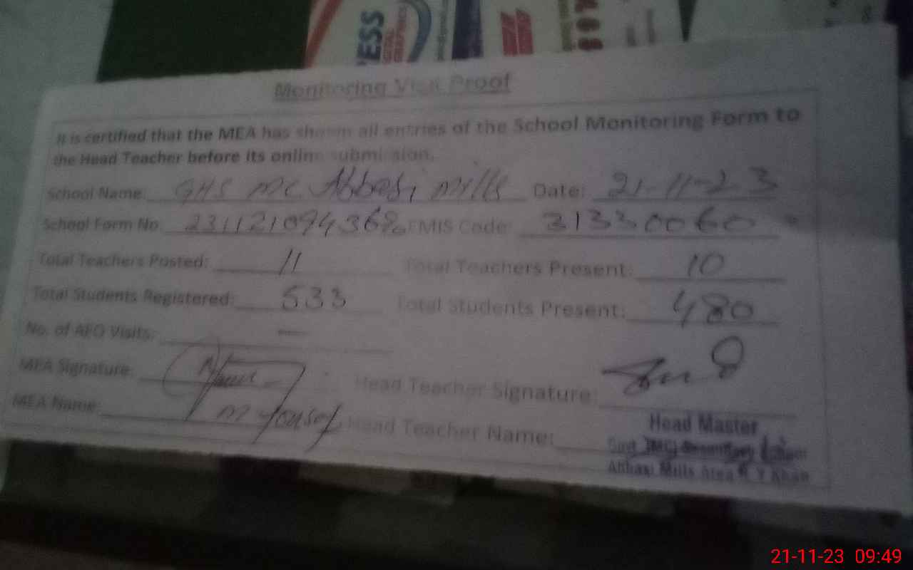 | EMIS Code: 31330060 | Name of School: GHS MC ABBASI MILLS AREA | |||