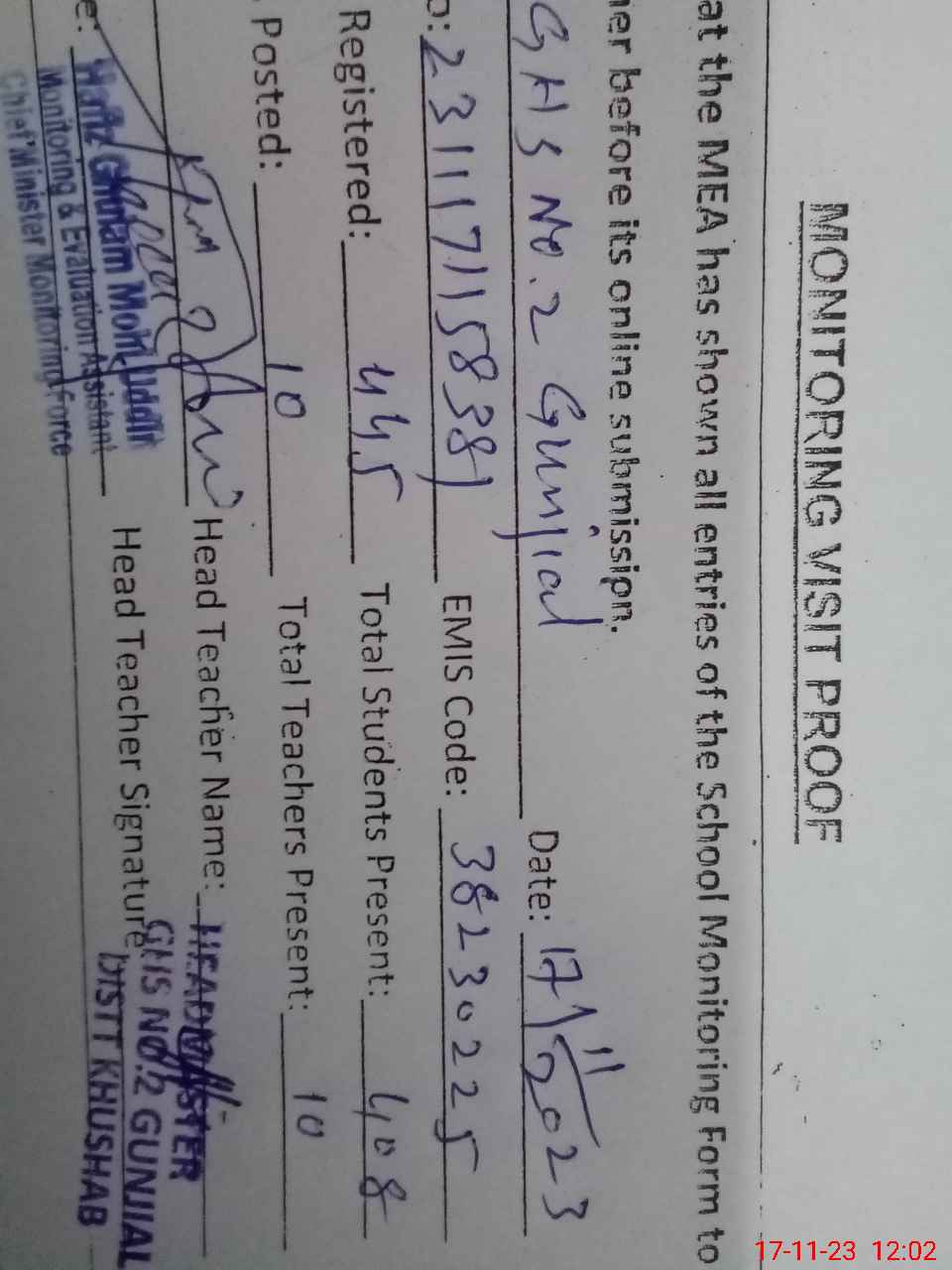 | EMIS Code: 38230225 | Name of School: GHS NO. 2 GUNJIAL | |||