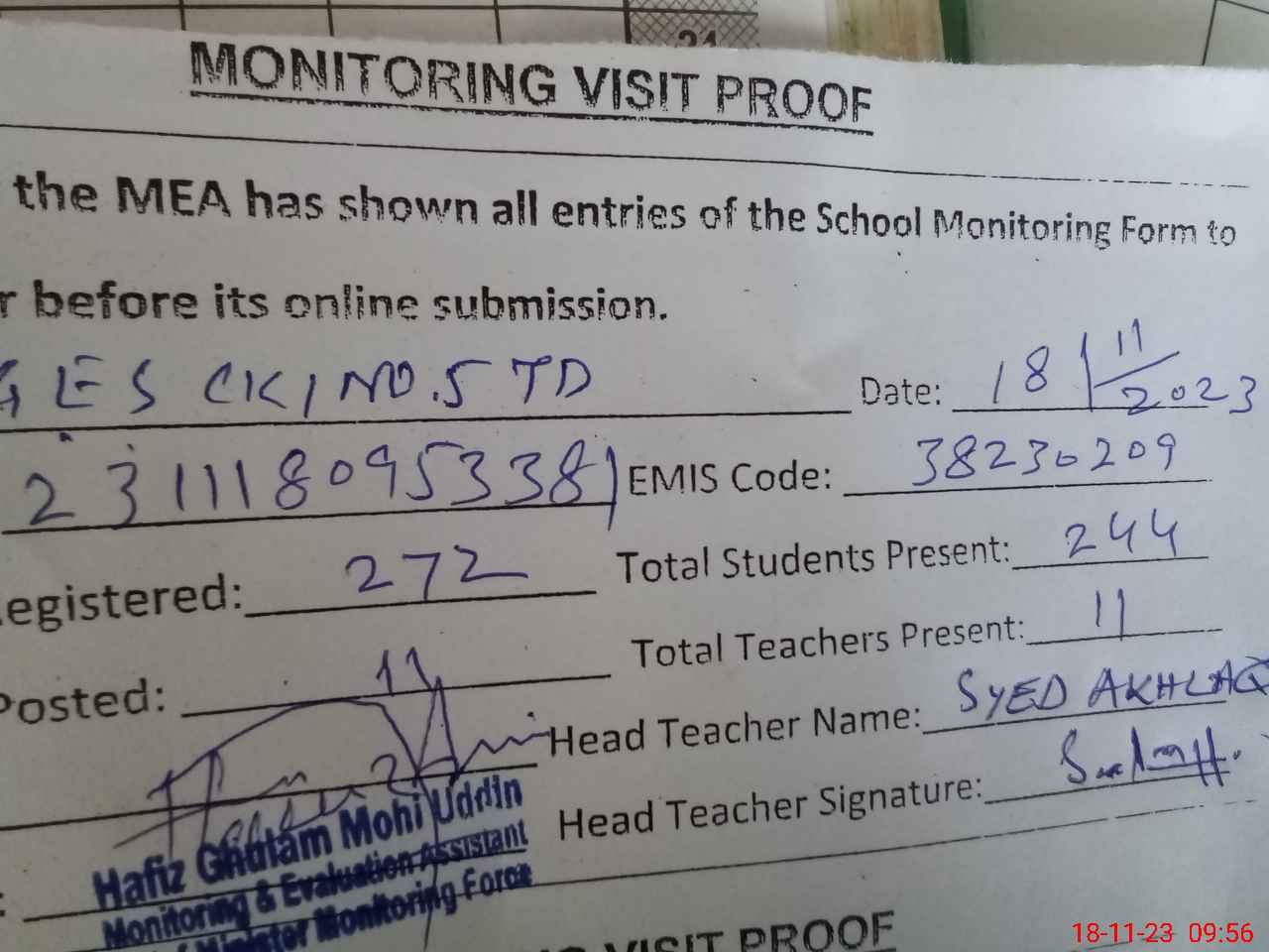 | Attendance Register | Head Teacher | MEA with School | Visit Proof |