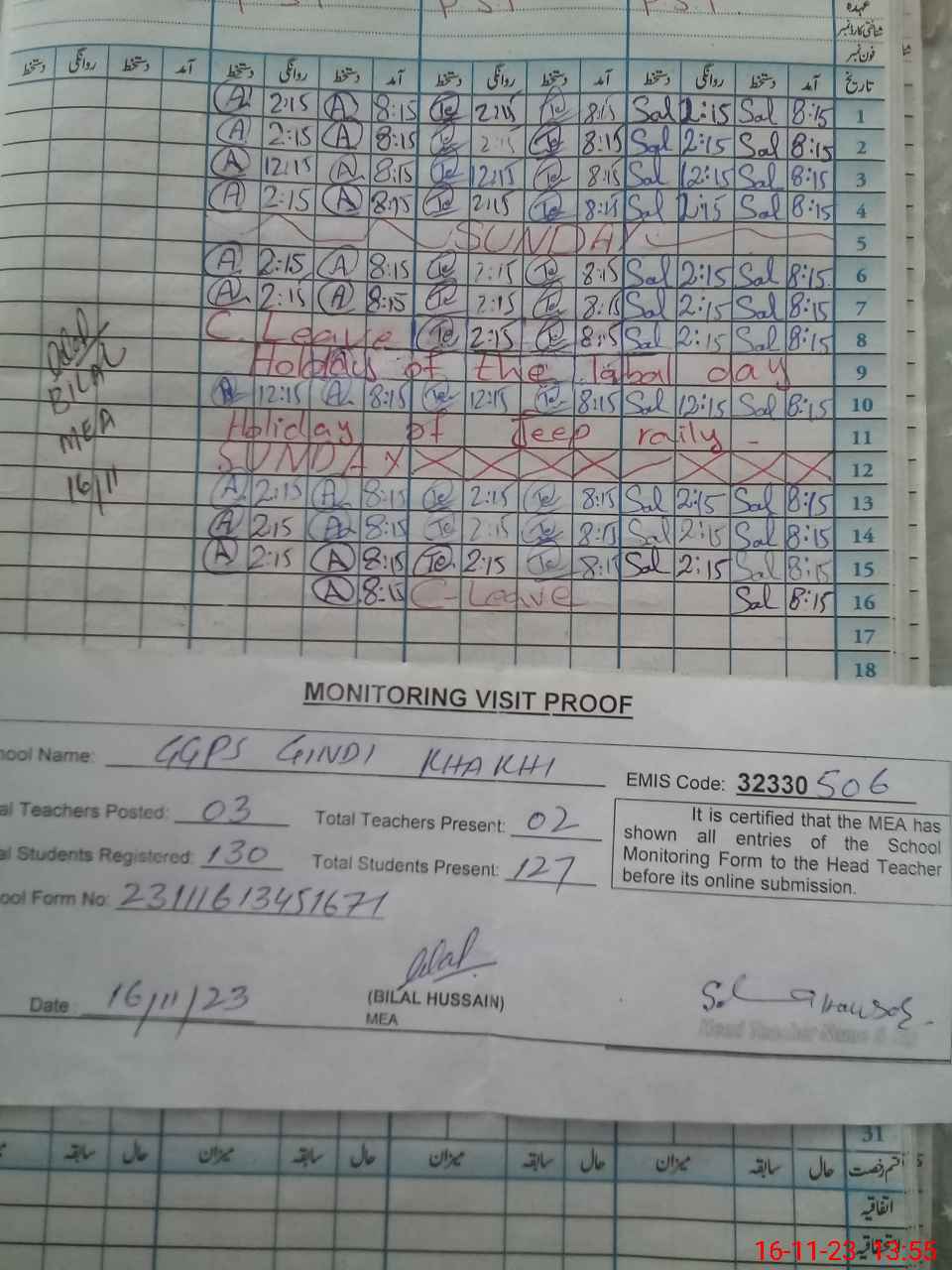 | Attendance Register | Head Teacher | MEA with School | Visit Proof |