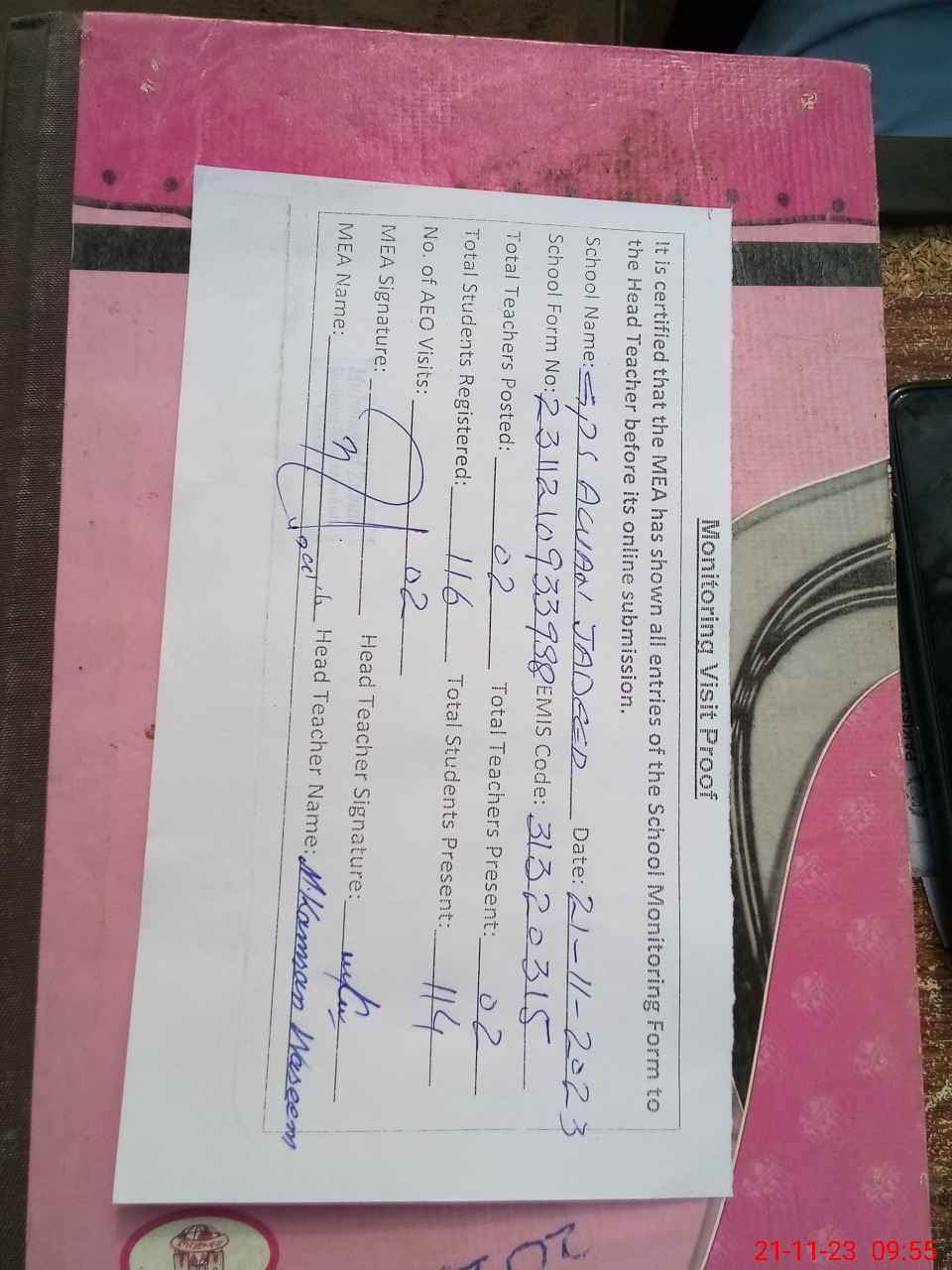 | Attendance Register | Head Teacher | MEA with School | Visit Proof |