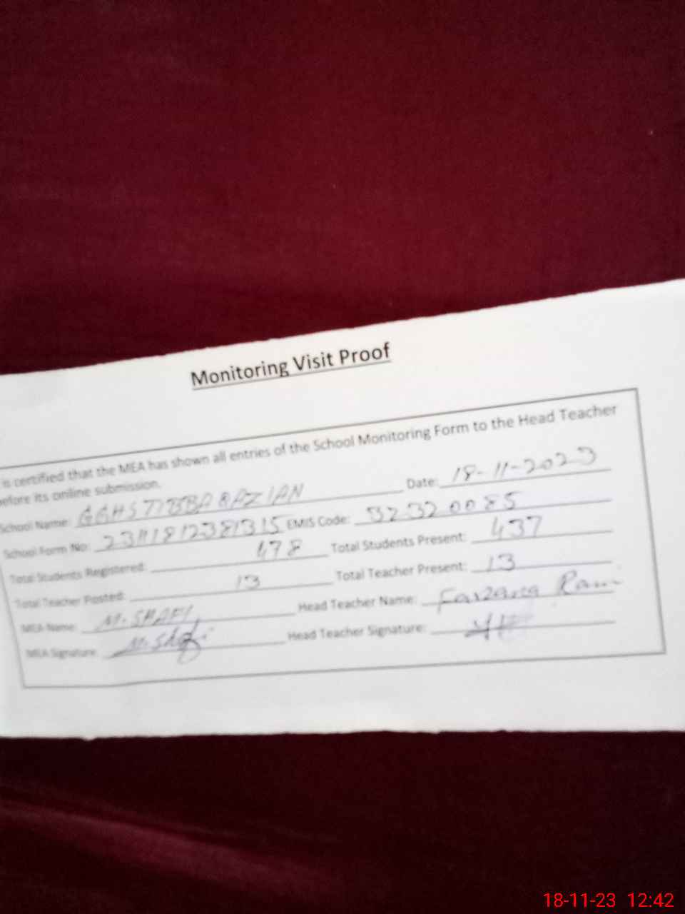 | Attendance Register | Head Teacher | MEA with School | Visit Proof |