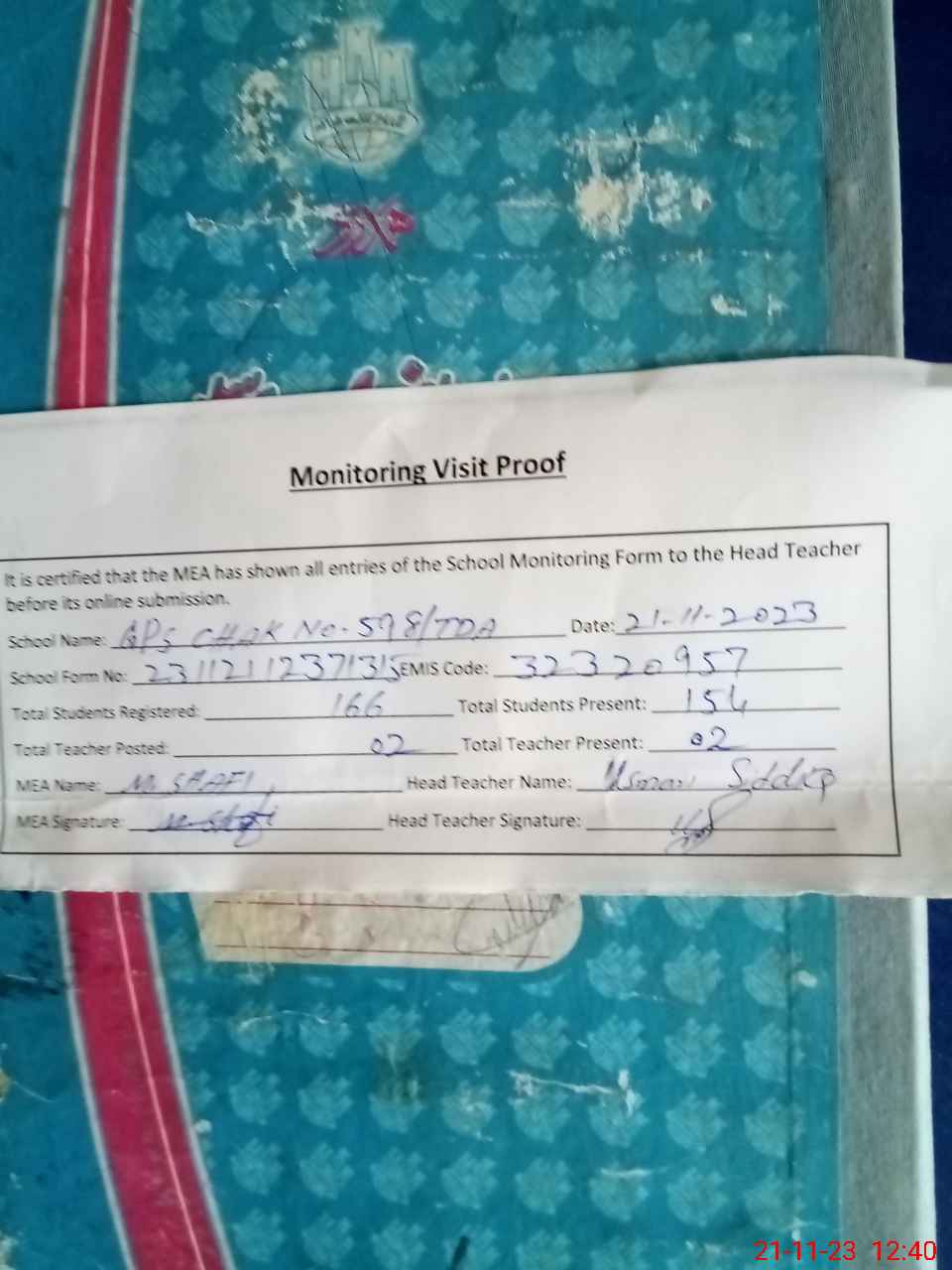 | Attendance Register | Head Teacher | MEA with School | Visit Proof |