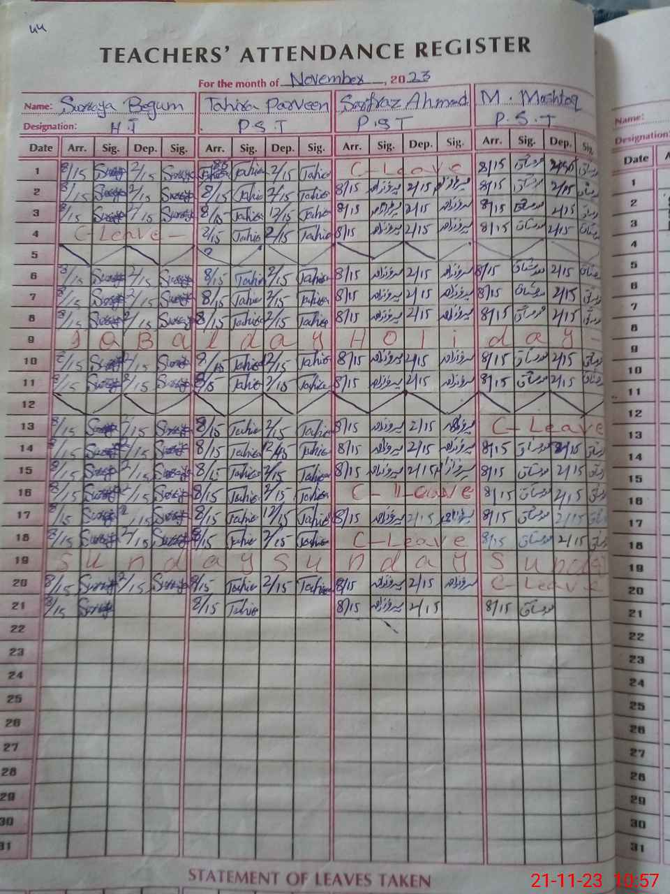 | CNIC | Full Name | Designation | R/C | Absence During Last Calender Month |