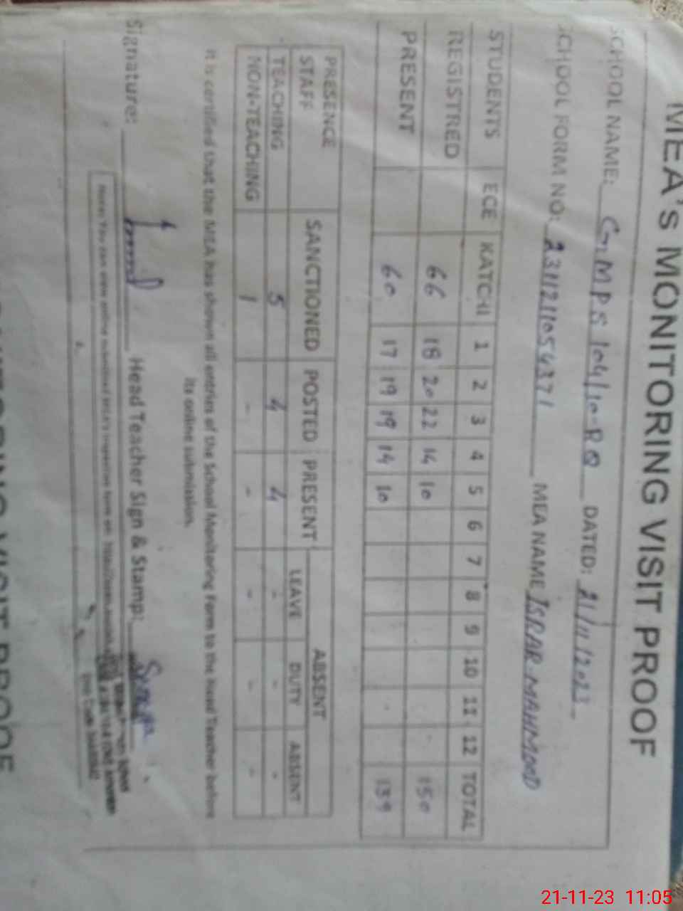 | Attendance Register | Head Teacher | MEA with School | Visit Proof |