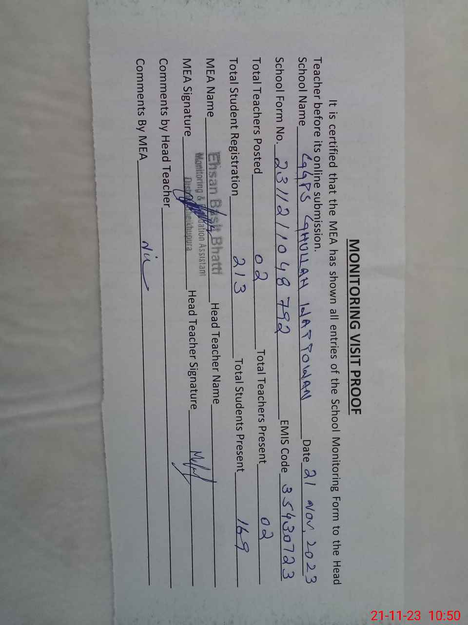 | EMIS Code: 35430723 | Name of School: GGPS GHULLAH WATTOWAN | |||