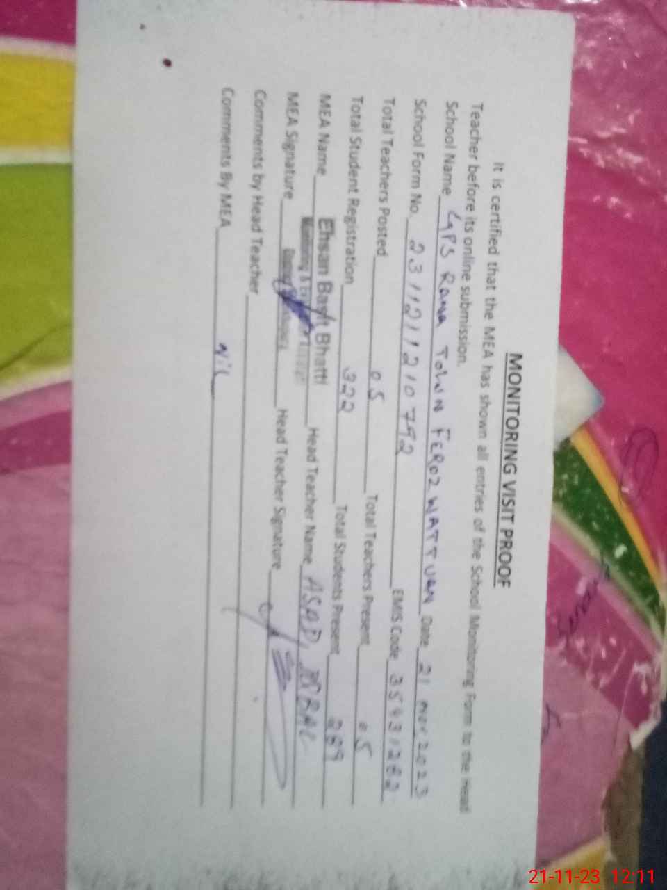 | Attendance Register | Head Teacher | MEA with School | Visit Proof |