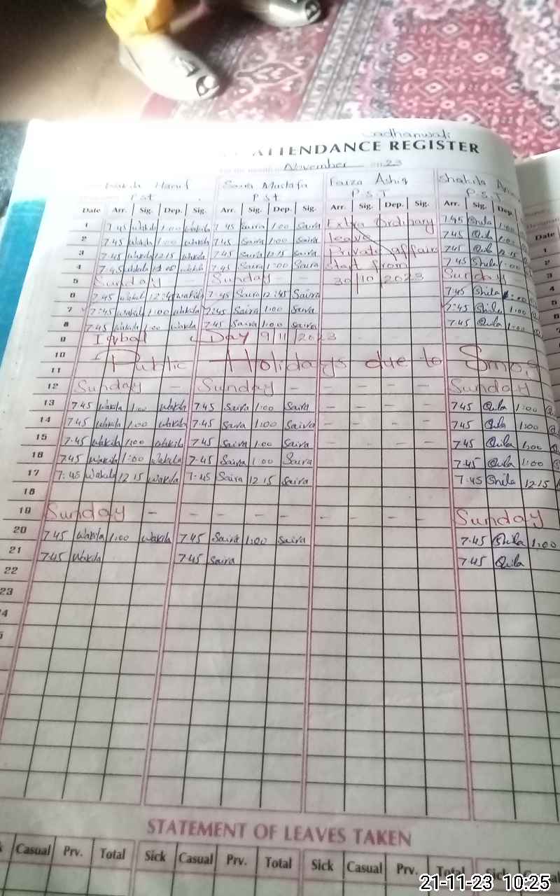 | Remarks (Use Separate Page if Required): Teacher Faizan ashiq marked on leave but leave not approoved | |||||