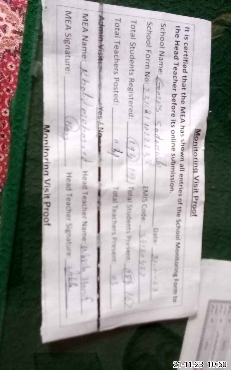 | EMIS Code: 34120427 | Name of School: GMPS SADAN WALI | |||