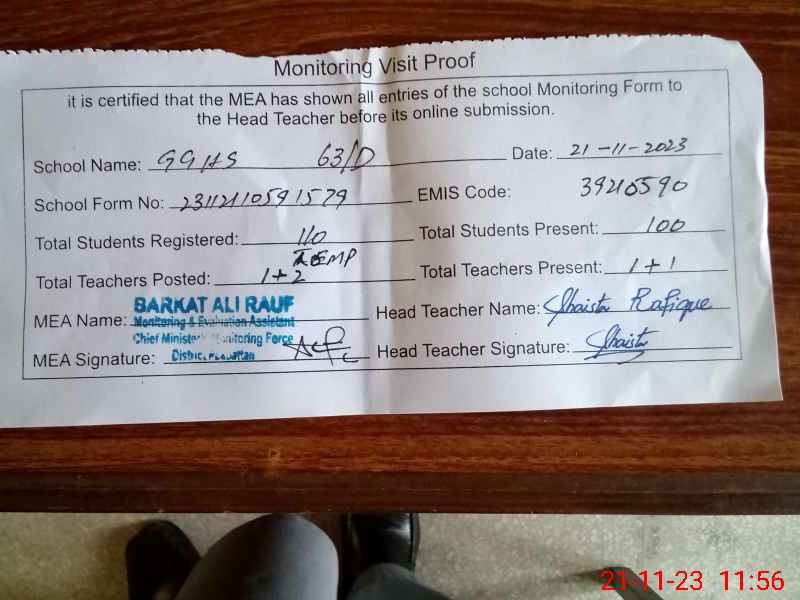 | EMIS Code: 39210590 | Name of School: GGHS 63/D CHOWK SIKANDER | |||